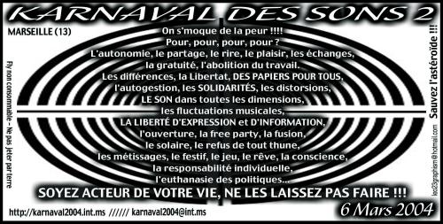 On se déguise..., Photos Karnaval des sons 2004 Publié par dinetteconnection le mars 26, 2004Mai 10, 2012 Un carnaval des sons dans le plus pur style des carnavals, revendicatif, manifestatoire, libre ! Parce que c,est toujours wizz de faire le con….. Partager : Partager sur X(ouvre dans une nouvelle fenêtre) X Partager sur WhatsApp(ouvre dans une nouvelle fenêtre) WhatsApp Partager sur Facebook(ouvre dans une nouvelle fenêtre) Facebook Partager sur LinkedIn(ouvre dans une nouvelle fenêtre) LinkedIn Partager sur Pinterest(ouvre dans une nouvelle fenêtre) Pinterest J’aime chargement… Similaire