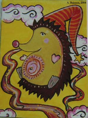 Linda est une amie, ma compagne de thèse, qui voulait un petit tableau. A la question « tu veux quoi comme animal? » Linda m’a répondue « un hérisson ». J’ai donc voulu exprimer un linda-hérisson dans sa sphère de béatitude ultime, une Linda étant l’être le plus Sage de la création.