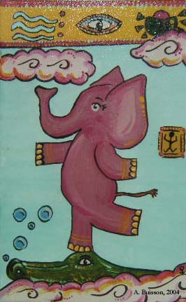Un éléphant rose. La pose de profil implique de fait un lien avec les gravures égyptiennes. Quelques bulles et nuages plus loin, l’éléphant plie mais ne casse jamais…