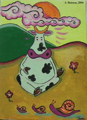 The first one ! Si les vaches ont décidé de regarder passer les trains c’est qu’elles ont envie de se laisser vivre. Il faut absolument que j’en peigne une. Ce sera un bon moyen de se mettre à la 2D. Quoi de plus naturel alors qu’une série d’escargots qui glissent paisiblement avec pour spectatrice une vache complice et attentive.