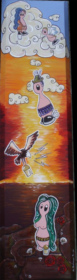 En haut du tableau est représenté(e) Hermaphrodite qui est issu(e) de l’union d’Aphrodite et Hermès. L’accompagne Éros (avec son arc et ses flèches) qui est considéré parfois comme un autre fruit des amours de ces deux dieux. Il renforce surtout ici la présence de sa mère dont il est un attribut incontournable.