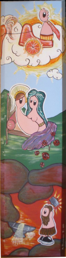 Héphaïstos, le dieu forgeron boiteux (en bas) ne savait rien de l’infidélité de sa femme jusqu’à une certaine nuit où les amants s’étaient attardés plus que d’habitude dans leur lit. Hélios, dieu du soleil (en haut, représenté avec son quadrige, char à deux roues, et des rayons solaires lui émanant de la tête) les surprit ensemble et rapporta la chose à Héphaïstos.