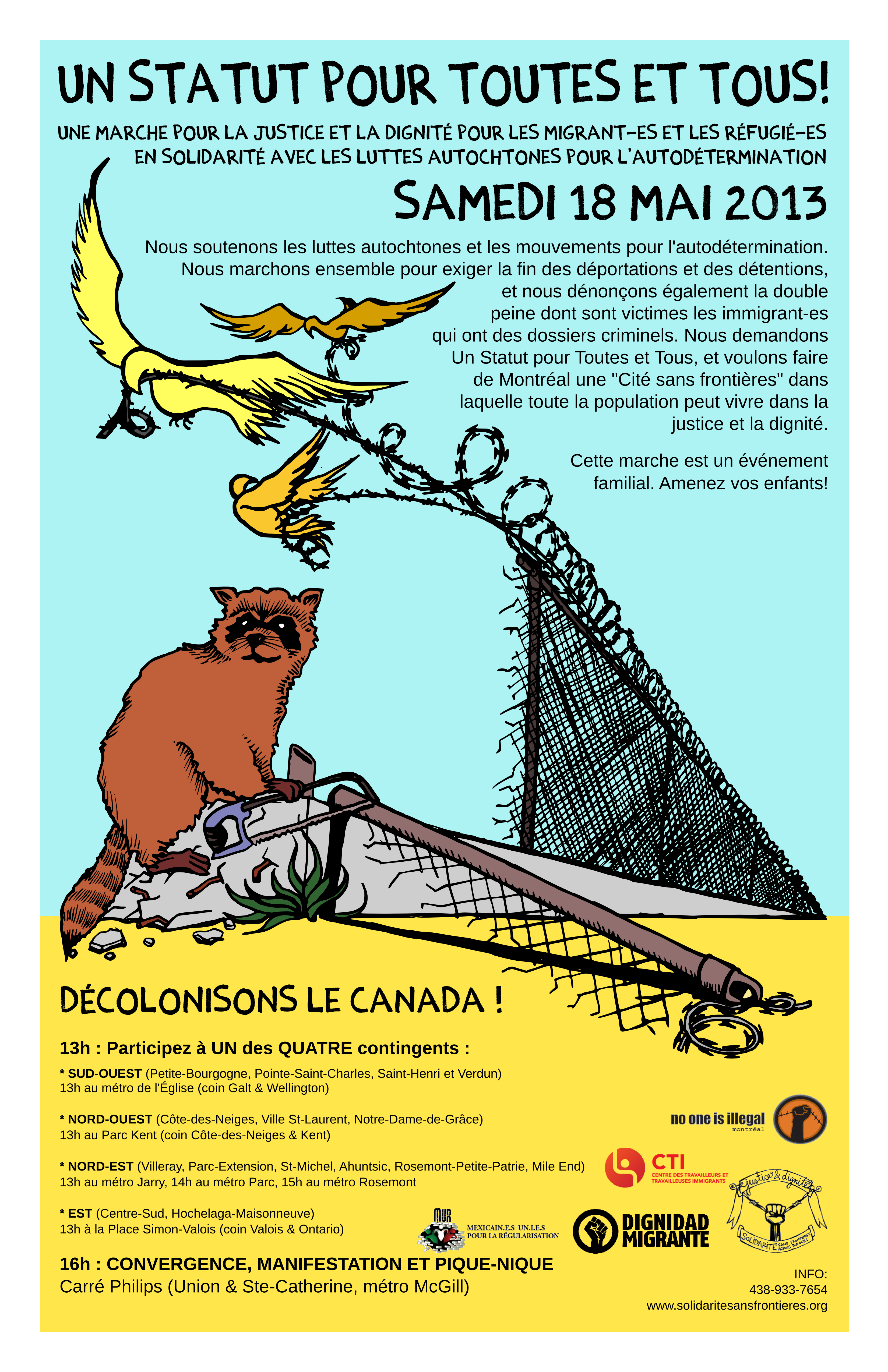 Nous marchons ensemble pour exiger la fin des déportations et des détentions et également pour dénoncer la double peine dont sont victimes les immigrant-e-s qui ont un dossier criminel. Nous revendiquons Un Statut pour toutes et tous et mobilisons pour construire une Cité sans frontières dans laquelle toute la population peut vivre dans la justice et la dignité.