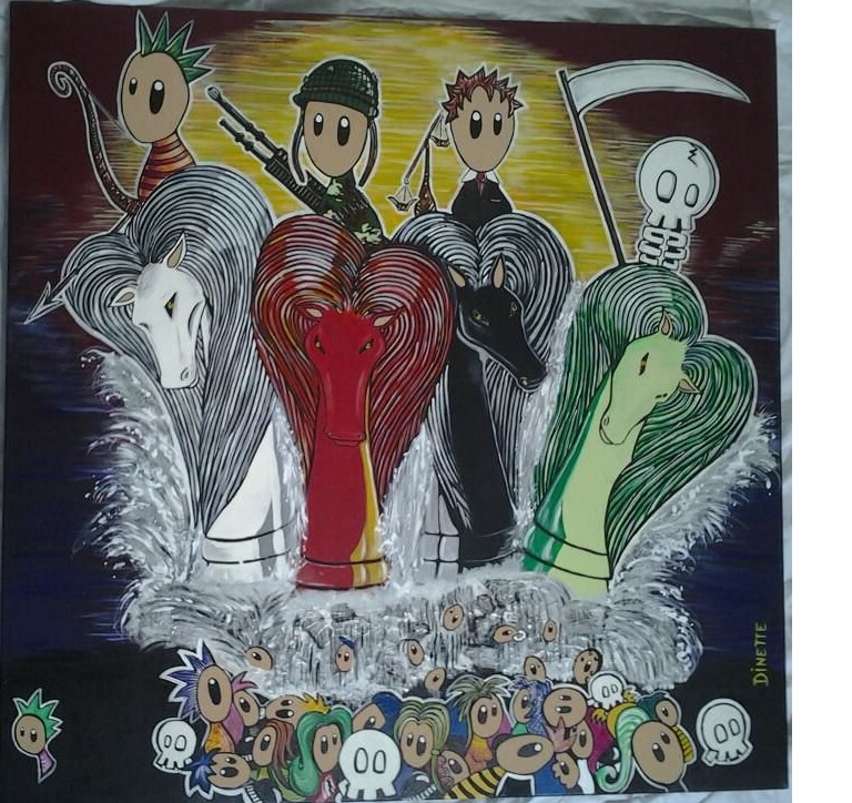 L’œuvre proposée explore le mythe des cavaliers de l’apocalypse afin de montrer la besoin de réifier nos peurs : les horreurs prennent alors un visage . La peur figée de cette fin du monde n’est qu’une manière de plus d’engluer les mortels dans la fange de leur existence, le combat est inégal face aux géants de l’ignorance, guerre, famine et mort et reflète bien notre perplexité face à aux réalités du monde.