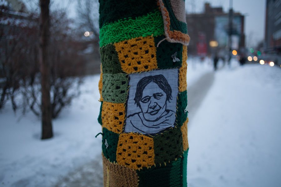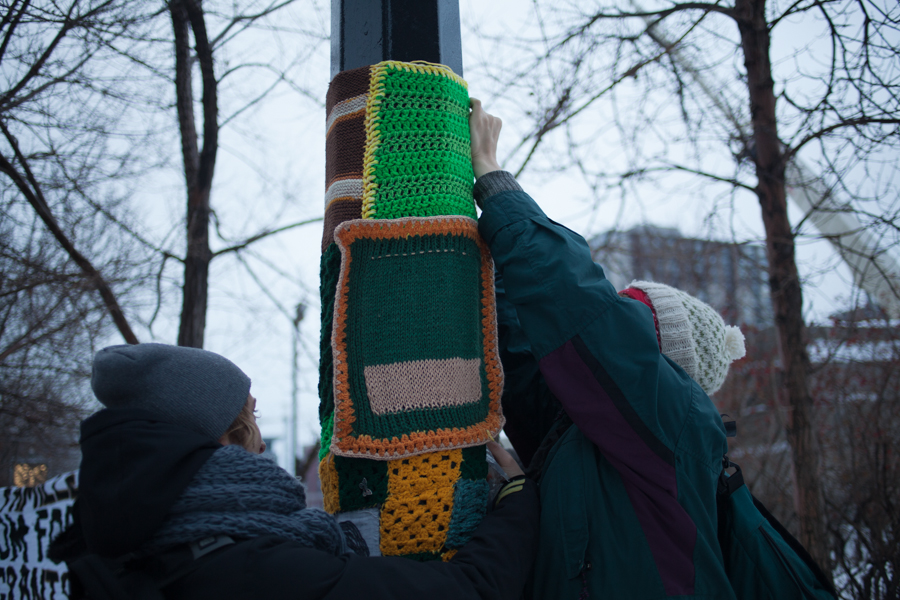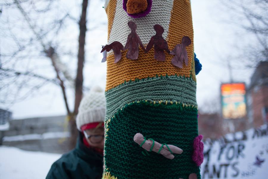 Montréal: le 18 décembre 2013 – Les lampadaires entourant le bureau de l’immigration et de la citoyenneté seront couverts de laine aux couleurs brillantes ce matin, dans le cadre d’une action « graffiti-tricot » tenue par les membres du comité de soutien à la famille Awan et le collectif «No Borders». L’action se déroule durant la journée internationale des migrants, une journée commémorative des luttes communes auxquelles font face les migrants du monde entier. C’est aussi pour souligner la lutte de la famille Awan pour un statut, la justice et la dignité.