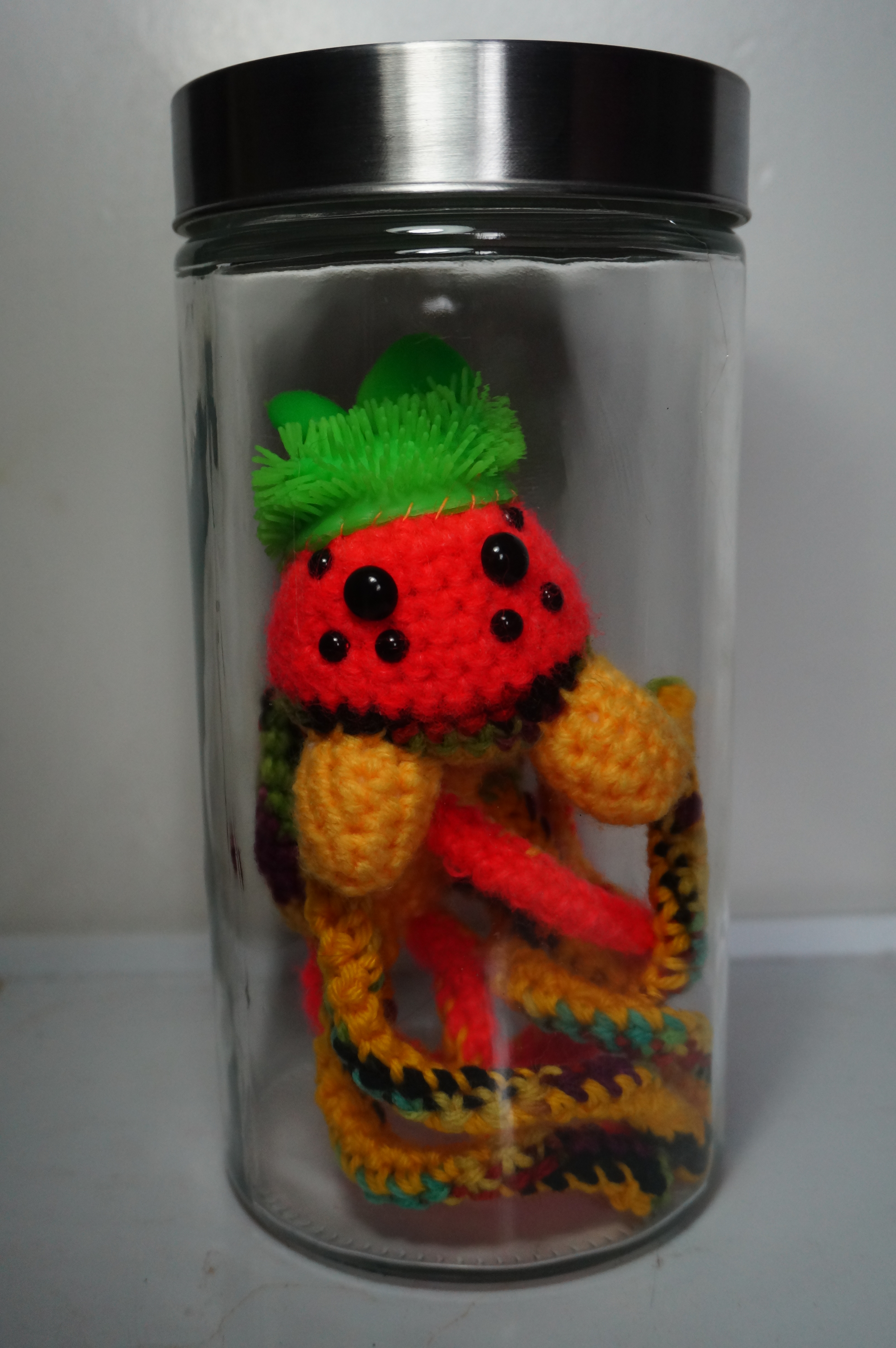 En ces délires de profondeurs abyssales, la petite Arachné est la seule créature à ne pouvoir se mouvoir dans les fosses marines. Elle est donc contrainte à patauger à la surface se faisant l’unique témoin des ébats des monstres. Mais point d’inquiétude notre Gertrude est assez rusée pour s’être pourvue d’un petit bonnet de bain qui lui va à ravir…..