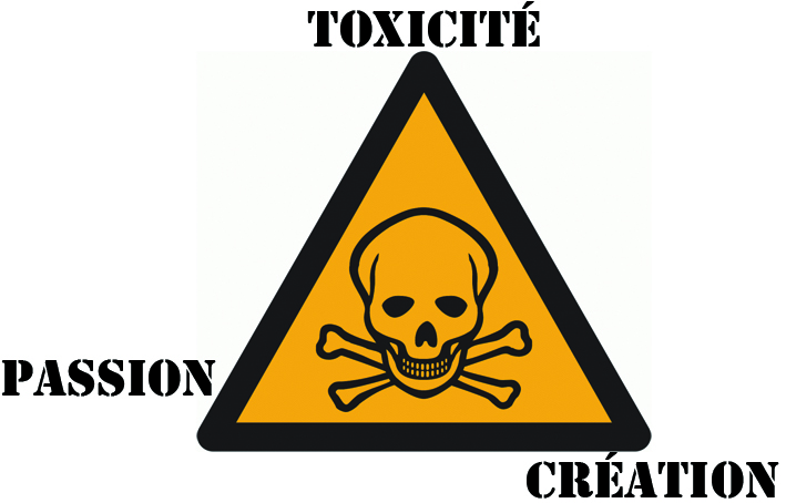 e bazar qui est le nôtre, la passion qui guide nos pas, vient tourmenter les équilibres. La passion embrase et ses flammes me fascinent, point de manichéisme à la clef. Et si je me réfère à une définition simple de la toxicité soit la mesure de la capacité d’une substance à provoquer des effets néfastes et mauvais pour la santé ou la survie chez toute forme de vie, je peux concevoir les différents sommets d’un triangle quasi-amoureux. La toxicité devient donc la capacité, inhérente au processus créatif, de produire des effets nocifs chez un organisme vivant.