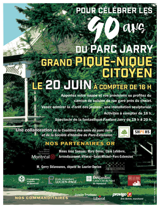 Un grand pique-nique citoyen est organisé le 20 juin, à compter de 16 h, pour souligner les 90 ans du parc Jarry, notre parc! Soyez de la fête! Le parc Jarry a 90 ans mais il est toujours vert! Et en plus il a pu être un peu tricoté, toujours avec l’aimable collarboration de mimine, Mémo-matic Singer 322.
